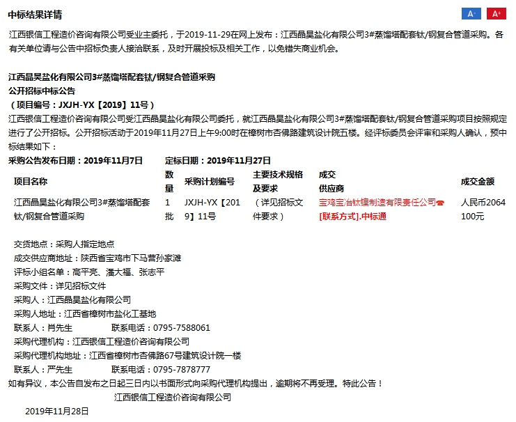 3、江西晶昊鹽化有限公司3#蒸餾塔配套鈦/鋼復(fù)合管道采購