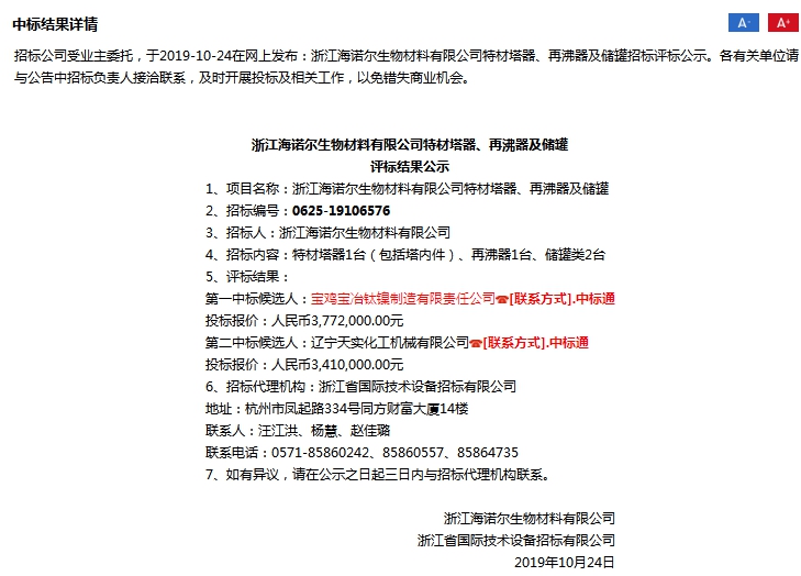 5、浙江海諾爾生物材料有限公司特材塔器、再沸器及儲罐采購